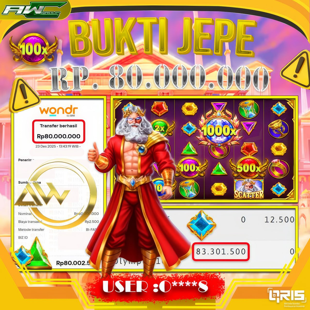 ID : O****8 JACKPOT PAUS DI SLOT PRAGMATIC PLAY NAMA GAME : GATES OF OLYMPUS 1000 TOTAL WITHDRAW : 80.000.000