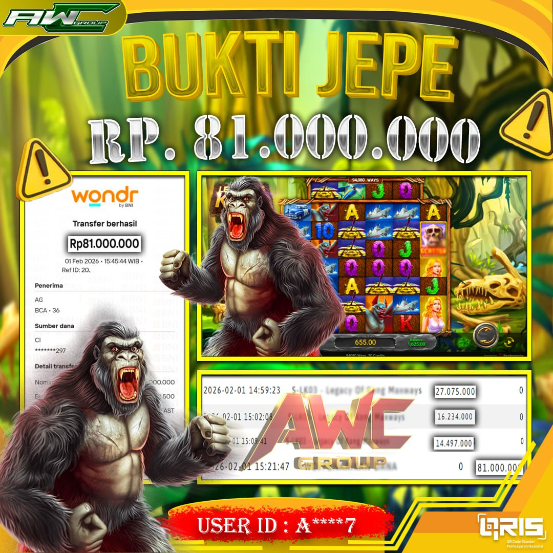 ID : A****7 JACKPOT PAUS DI SLOT SPADEGAMING NAMA GAME : LEGACY OF KONG MAXWAYS TOTAL WITHDRAW : 81.000.000